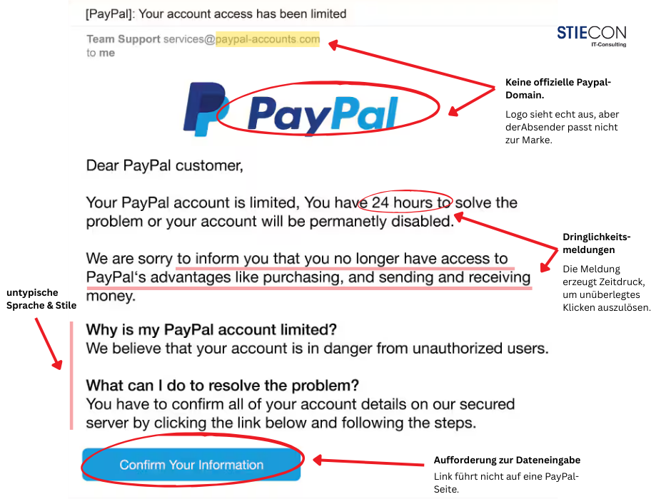 Phishing-Mails erzeugen oft ein Gefühl der Dringlichkeit, z.B. durch Androhung der Sperrung Ihres Kontos, wenn Sie nicht sofort handeln.